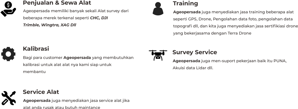 Ageopersada hadir untuk membantu dan mensukseskan segala jenis pekerjaan bapak atau ibu semua ,mulai dari instansi pemerintah, semua jenis pertambangan, Survey kelautan, kehutanan, Topografi, Perkebunan DLL, karena alat alat yang kita miliki memiliki spesifikasi yang sudah teruji dan mumpuni untuk segala kebutuhan pekerjaan anda.